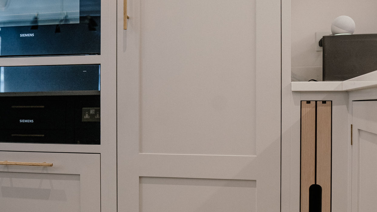 A stunning in-frame kitchen featuring classic shaker-style doors and a bold blue island as the standout centrepiece of the design.
